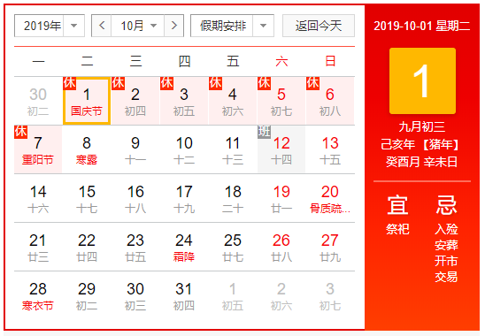 2019年10月1日至10月7日放假,共7天。其中,10月5日(星期六)、10月6日(星期日)、10月7日(星期一)為國慶節法定節假日